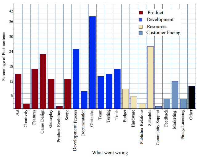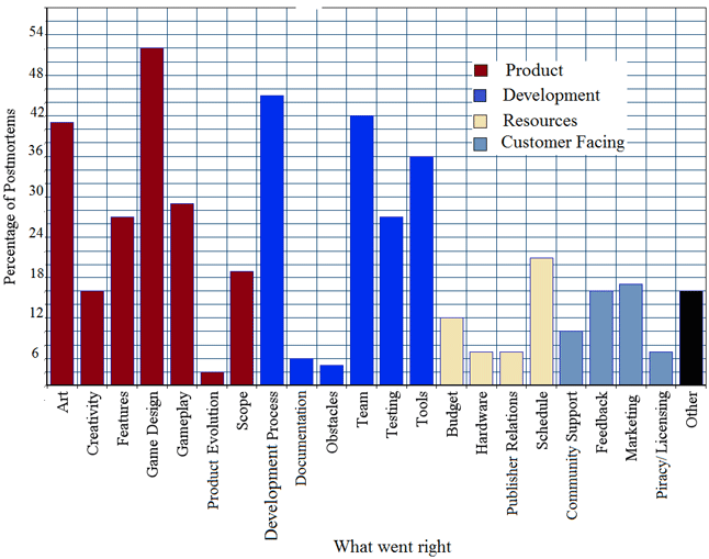 The team behind the new study split their analysis into 12 categories, including "art," "team," "marketing," and "scope." Below, you can see two graphs pulled from the study which quanitfy instances of "what went right" and "what went wrong" -- the two standard sections in Game Developer and Gamasutra postmortems -- across these 12 categories.