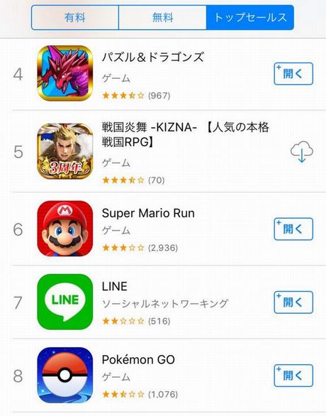 (In Japan, Mario's home ground, Super Mario Run was ranked 6th on the first day grossing ranking. )