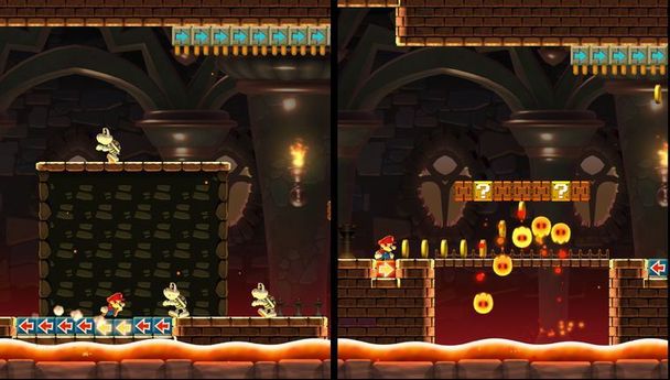 Also, players can extend the jump distance by Mario's Spinning in the air and control the timing to advance by the new gimmicks like Stop Block. Mario uses new gimmicks such as Arrow Block and Long Jump Block to do various jumps like Backflip and long jump.