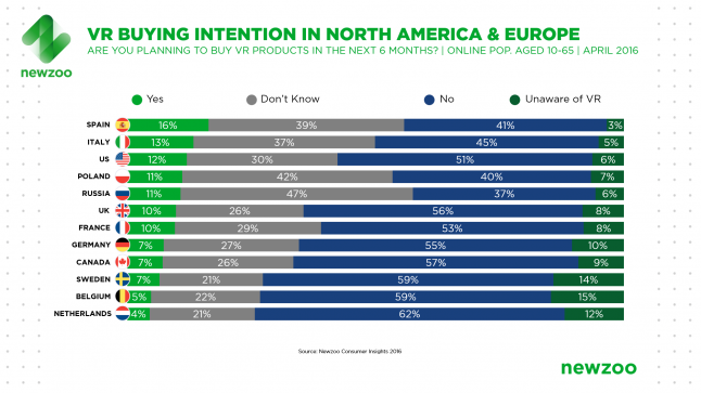 Market research firm Newzoo has published findings from a new multinational VR-focused survey which suggest that roughly 12 percent of American respondents plan to buy a virtual reality product in the next six months.