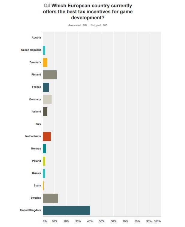 Sweden and Finland came in as distant second and third, with 12 percent and 11 percent of respondents (respectively) naming them the best countries in Europe when it comes to tax incentives for game makers. Of course, it's important to note that not all of the countries voted for have comprehensive tax breaks; some were considered more 'tax-friendly' than others by survey respondents.