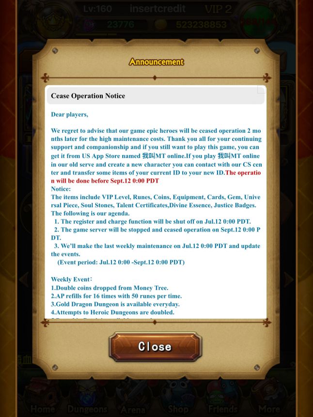 Epic Heroes is a free to play mobile game, called I am MT in China. It was the top grossing game in China in 2013, and continues on rather successfully in its home country. But on September 12, developer LocoJoy is shutting down the English language servers – where I played – forever.