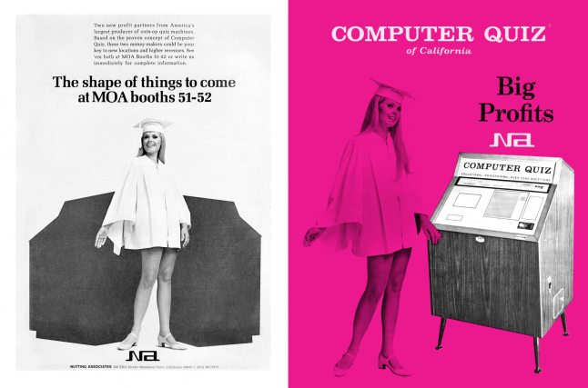 Willaert draws together ads for arcade games (we've taken the liberty of excerpting one below, for the electro-mechanical game Computer Quiz) around this time and showcases how they evolved to become more like car ads, promoting the machines as sleek status symbols accompanied by an attractive model.
