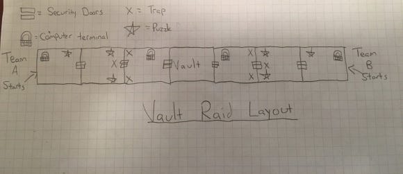Vault Raid is a team-based competitive game. Two teams of 2-4 players each compete to infiltrate a secure bank vault in the shortest time possible and escape with all the money inside before the other team does. To do so, each team must solve a series of puzzles to unlock security doors deeper into the vault while deploying traps to slow down their opponents.