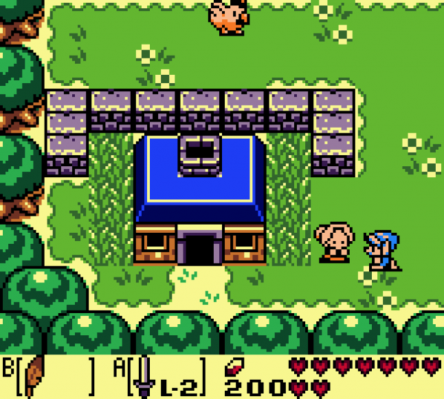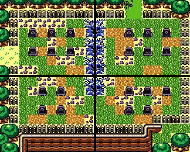 I love Link's Awakening’s extremely reserved use of tiles, and efficiency with space. Every room has an interesting shape, the background tiles use a very minimal amount of antialiasing to occasionally introduce interesting shapes and curves, and rooms are often reduced to their very basic ideas. But you don’t want multiple rooms to feel the exact same, and Link’s Awakening does this wonderfully. Here’s a simple 4-screen graveyard in the game: