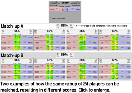 Okay, so we have 100+ players that all need to be put in matches, how do we decide what's the best match-up? For example, if we can choose between making a match where the players have equal skill, or one where the ping is low, which do we prefer? And which do we prefer if the difference is more subtle, like we can get slightly more equal skill or slightly better ping? Where do we draw the line? And how do we balance this against wanting to let premades play against each other? Etc. etc.