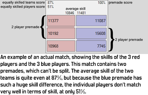 Premades. Ideally a group of 3 friends who coordinate together should play against a similar group and not against three individual players who don't know each other. Assigning a score to this is simple: if both teams have the same situation, then we have a 100% score. If there's a small difference (like for example a 3 player premade versus a 2 player premade + a solo player) then we get a 60% score. For a big difference (a 3 player premade versus 3 solo players) the score is 0%.