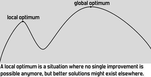 Especially the first swaps will improve the matches drastically, but we start seeing diminishing returns up to the point where no swaps can be found that are actually an improvement. There might still be some bad matches there, but no single swap will be an improvement overall. In other words: we've reached a local optimum. We almost certainly didn't find the best match-up possible for those 100+ players, but we can't improve this one any further with our current swapping algorithm.