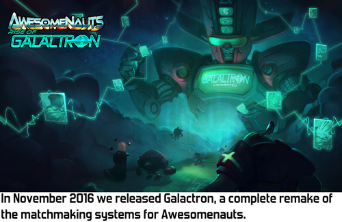 Matchmaking is a big topic with lots of challenges, but at its core is a very simple question: who should play with whom? A couple of years after releasing Awesomenauts we rebuilt our entire matchmaking systems, releasing the new systems in the Galactron update. Today I'd like to discuss how Galactron chooses who you get to play with. While the question is simple enough, the answer turns out to be pretty complex.