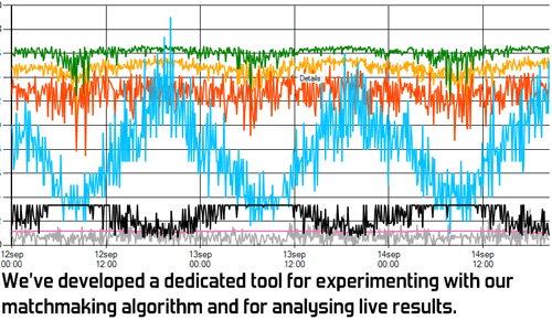 Opponent variation. This is a subtle one that we added a while after launching Galactron. Since our matchmaker basically looks for players of similar skill with a good connection to each other, it tends to repeatedly put the same players against each other. We expected this to be rare enough that it would be fun when it would happen, but in practice our players encountered the same people too often. To counter this we give a match a lower score if players encountered each other in the previous match as well. If they encountered each other as opponents but are now teammates (or vice-versa) we give that a slightly better score than if they meet each other in the same situation (opponents before, opponents now; or teammates before, teammates now). This gives the matchmaker a slight tendency to swap teams around if despite this rule it ends up making another match with the same players. This rule has a very low weight since we value the other rules more, but still this rule improved the situation significantly and we got much fewer complaints from players about this.