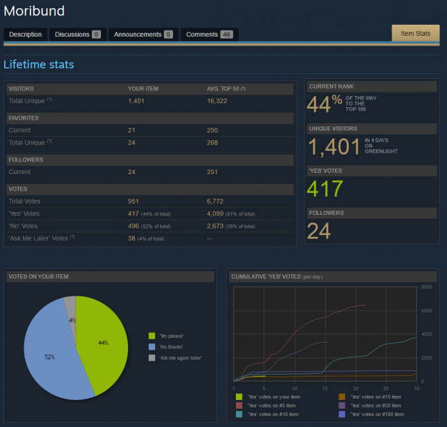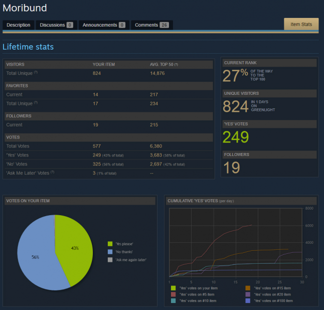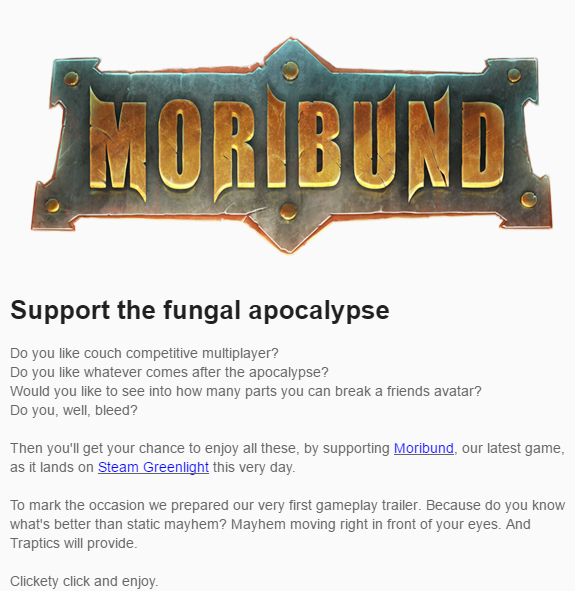 Moribund (our game) launched on Greenlight on April 20th. Before launching we sent a newsletter to about 1200 sites and editors about our new game. We had very little coverage. On the day of the Greenlight launch we sent another including the Greenlight page (be sure to take a look, so you know what this post is about), our very first trailer and new screenshots. Again not many people cared. We do have indeed a niche market (focusing on local multiplayer games) however I am not aware whether that is indeed a problem for press sites despite what seems to be a growing trend around local multiplayer games. But, anyhow, maybe the game is not catchy enough.