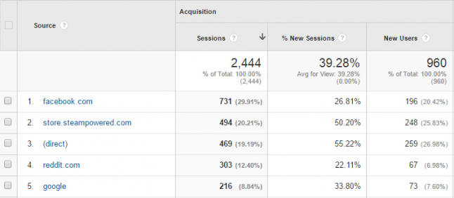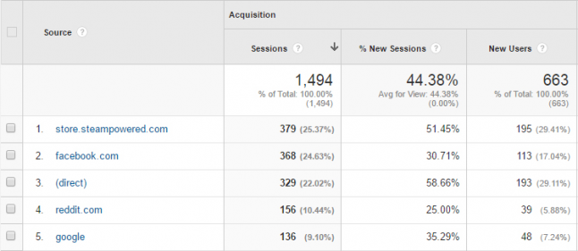 Now, regarding our promotion. Most of our fans and friends are gathered at our facebook page, which I don’t really see as the norm. Most have them gathered at their site or twitter account or some other medium. We had our site wiped about 3 months ago, so the current one is relatively “new”. These guys really helped the first day, and as you can see below it was our best traffic source (besides steam).