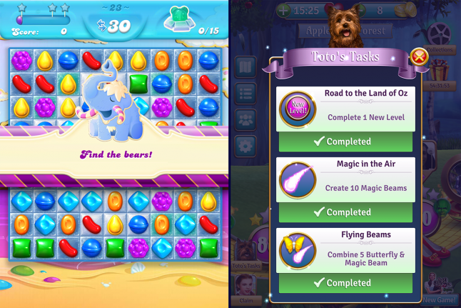 Pictured above: the left image from Candy Crush Soda Saga shows how a level's objective can be easily summarized, and on the right we see how Wizard of Oz Match tries to add goals for a play session through quests. While casual puzzle games have traditionally had concise, appealing short term goals, long-term goals have been second priority or nonexistent. Until recently, these further out objectives have taken a back-seat despite their potential for making a more engaging experience for players and increasing the regularity of their sessions.