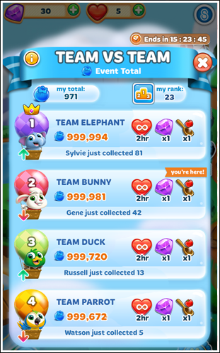 For example, the “Global Events” present in Storm8’s Hungry Babies (a game I worked on) introduces any number of secondary goals revolving around the game’s core mechanic: making matches. A piece is designated as the event’s focus, and collecting that piece adds to your event total. Multipliers are added for making larger matches and clearing levels, which adds a layer of rewards for player competency. Additionally, totals are tracked via an event leaderboard and players can be grouped into teams depending on event type, with larger rewards for teams that perform better. Smash tiles while smashing your opponents!! It's questionable whether competition alone plays a large part in match3 player motivations, but striving for more boosts is sure to get a puzzler’s blood pumping.