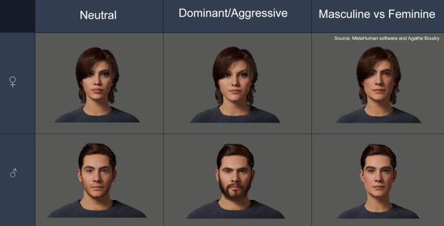 In accordance with these findings the MetaHuman software can be used to create a more ‘dominant/aggressive’ looking character. When aiming to create a more dominant character primary cues of above research should be kept in mind. Key factors such as facial width, eyebrow stance, nose size, forehead positioning and levels of cortisol, should be looked at and the grids made by Třebický et al. (2013) and Gonzalez-Santoyo et al. (2015), used as references.