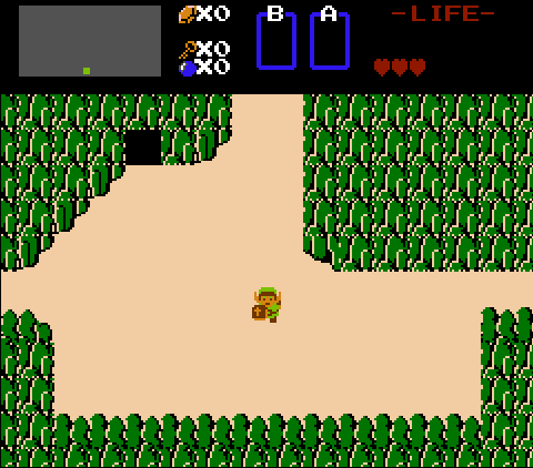 The Legend of Zelda’s single largest achievement is its faith in the player. You are not confined. You are given free rein to go where you please. The first screen you see is an overhead view of your character in a field surrounded by mountains. Paths await to the north, to the west, and to the east. A single black opening in the rocks beckons.