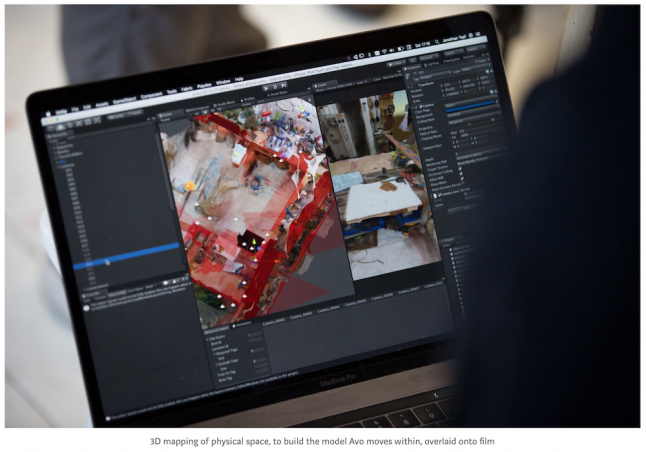 So what’s going on within Avo? The direct manipulation mentioned earlier, and the sense that this lends of “touching TV itself”, is in part enabled by a game engine (presumably Unity) and its ability to drop interactions on top of 3D environments mapped onto pre-filmed sequences. In other words, you control the Avo in Avo by moving a real-time animation over a set of filmed physical backdrops and scenes, of Billie’s studio, or of other locations. By apparently moving Avo freely in that world, you lean-in to the point of being-in. Avo exists on a separate layer super-imposed onto the set, yet thanks to real-time lighting effects and 3D scanning the bumpy green protagonist feels situated within, rather than upon. And so do you. This apparent freedom, albeit necessarily limited, moves Avo beyond Bandersnatch, with the latter really only a stack of pre-filmed elements piled up in an somewhat editable sequence. One ends up feeling rather disengaged, particularly when the experience is overlaid with the cynicism drenching the narrative, and thus it is essentially lean-out.