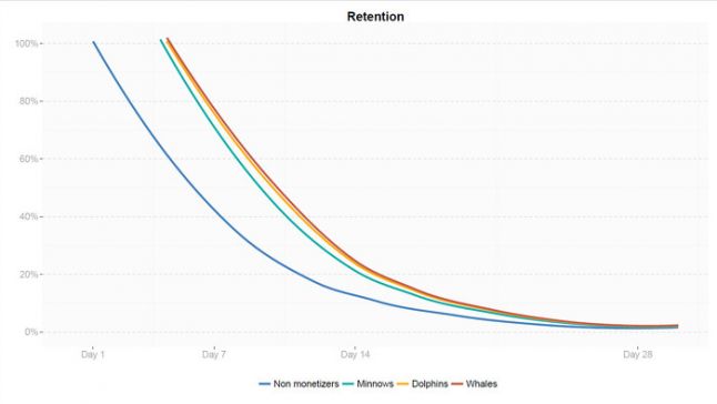 Usually, unpaid gamers tend to try more different games than dolphins and whales. Dolphins and whales are more loyal and focus on playing a few or even only one game. (You can see the definition of the different cohort in the GameAnalytics report)