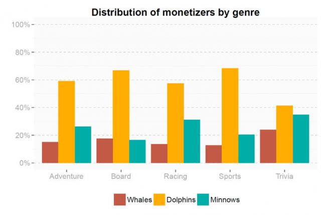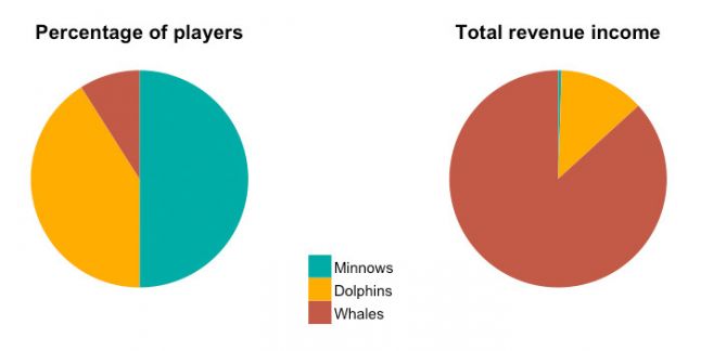 Other than the large group of unpaid gamers, monetizers in this report are categorized into 3 types: minnows (lowcore), dolphins (midcore) and whales (hardcore).
