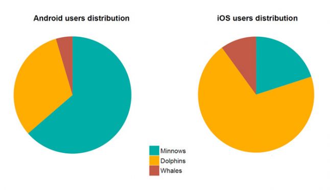 More than 60% of the Android users are minnows, while iOS users' population are dominated by dolphins. Around 70% of the iOS users are dolphins, with only 15% being minnows.