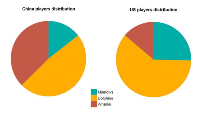 According to the data provided by GameAnalytics, 64% of the US gamers are dolphins compared to 48% of China. However, China weighs way heavier than the US on the percentage of whales, which is 37.37% China and 14.42% US. On top of that, Chinese whales spend $347.39 on average while US ones spend $283.90.