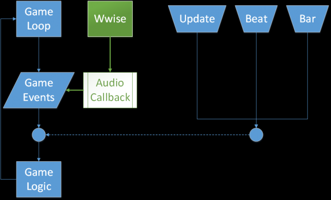 We have our normal game loop where events occur each frame, and each event executes its respective game logic to make the gameplay work. Using specific callbacks from Wwise, we were able to intercept information about the music, such as when beat events and bar events occur. These events alongside our normal Update event were the 3 main driving events in our engine.