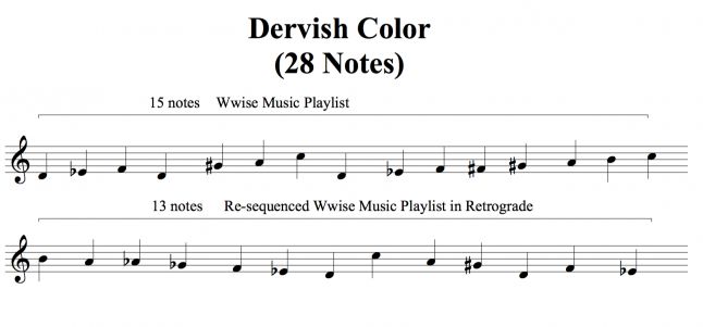 Each Dervish shot plays back a single musical note made using a synthetic clarinet-like instrument. The Dervish shots are placed into a Wwise music playlist container that features the following sequence:
