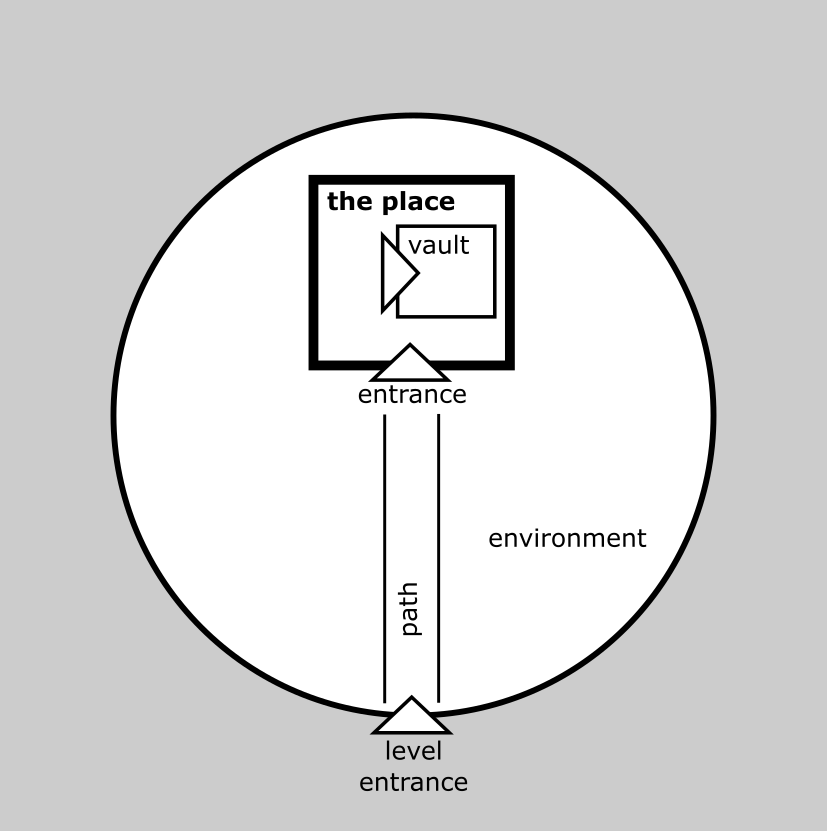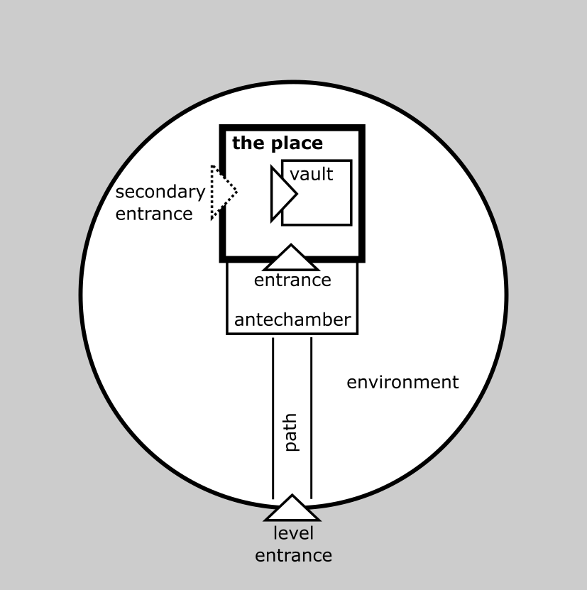 In most cases the place is connected to the path through an entrance. We refer to the space or room before the entrance as the ‘antechamber’. Conceptually the antechamber might be part of the place, but it does not need to be. If the place is a castle, and the environment is a light forest, the antechamber might as easily be a clearing in front of the castle or an outer bailey. Structurally it is important that the antechamber is located before the entrance into the place, and as we shall see below, offers the opportunity to place encounters or thematic level features on the obvious path leading towards the place.