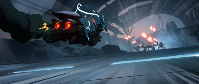The look and feel Housemarque's artists crafted to complement this fiction is an homage to the 1980s lineage of Jarvis' arcade era classics — a retrofuturist twist on cyberpunk that they dubbed "cablepunk."