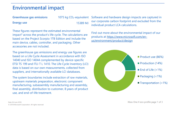 Consoles, in contrast, are much more weighted toward energy consumed during use. According to the publicly viewable Eco profile provided by Microsoft for its Xbox consoles, the Xbox One has a 1,114 kg CO2-equivalent footprint over an 8-year lifespan, including manufacturing and energy use. In its breakdown of environmental impacts, 82% of this footprint is caused by product usage, with another 14% from production.