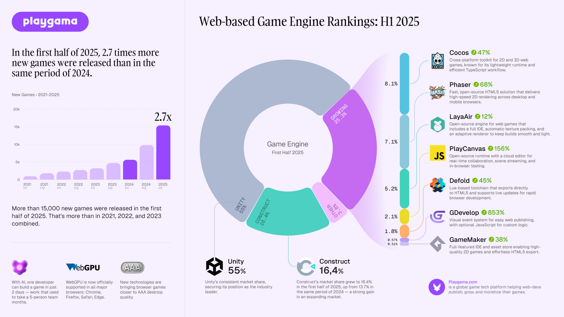 However, Playgama stated that more accessible game engines, such as Phaser, LayaAir, and Cocos, are growing in popularity, with no-code engine Construct's market share increasing from 13.7% in the first half of 2024 to 16.4% in the same period of 2025.