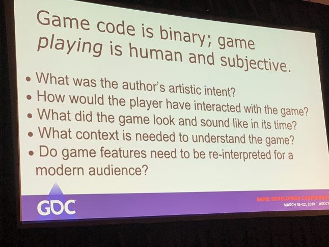 Wawro: This slide, from Video Game History Foundation founder Frank Cifaldi's talk on "It's Still Emulation: Saving Video Game History Before It's Too Late", reminds us how important it is to have people who are working to preserve video game history. While a well-designed game can teach a player how to play, it takes an expert to teach you why the game was played, and what that experience was like.