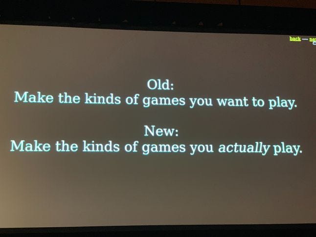 Wawro: Veteran indie dev Jason Rohrer threw up this slide during his talk on "2014 vs. 2018: The Shape of Financial Success Before and After the Indiepocalypse" to reinforce one bit of advice: if you're worried about making a great game that nobody will buy, look at your own play history and try to create the sort of game you actually play for long periods, rather than the kinds of games you keep telling yourself you'd like to play.