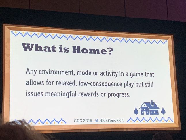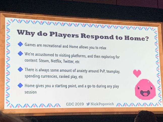 Wawro: In these other two slides (second slide below) from Popovich's talk, devs are encouraged to create a place or mode that feels like "home" in order to give players a comfortable, low-stress place to hang out or return to without much friction. This encourages them to keep playing your game, even after long periods away, which in turn raises the odds that they'll buy some DLC, or inspire a friend to buy a copy as well.
