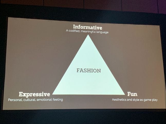 Wawro: This slide, from the GDC 2019 talk on "Why Fashion in (Most) Games Sucks, and Why You Should Care" by Kitfox Games' Victoria Tran, illustrates the three axes along which the fashion in your games communicates meaning to players.