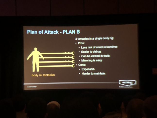 "Brennan's slide here contrasts to a prior slide that showed the results of creating an individual rig for each of Octavius' tentacles. She followed up by breaking down a lot of the pseudocode and mathematic principles that helped make drive the character's unusual limbs.