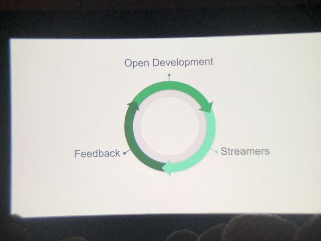 Boetel's talk was illuminating on a number of topics (the instant-feedback system he discussed showed off some amazing telemetry), but the slide above feels in conversation with the slide from Jason Rohrer's talk about how mid-sized developers should be approaching game development in 2019. The above diagram highlights how Unknown Worlds is able to leverage open development, into marketing, into feedback, and back into more development, and he noted how similar it is to how live development on games-as-service titles works.