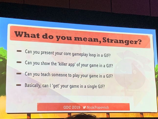 Wawro: In his GDC 2019 talk on "Making Games That Stand Out and Survive" Slime Rancher director Nick Popovich encouraged devs to think of their games in terms of animated .gifs. If someone can 'get' your game in a single .gif, argues Popovich, then you've eliminated a lot of the friction that might keep them from buying a copy.