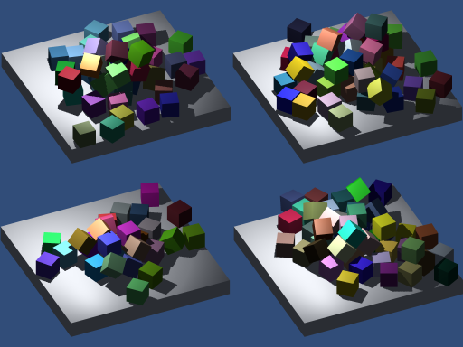 (50 cubes dropped from same height one after another via script, 4 runs and 4 different outputs)