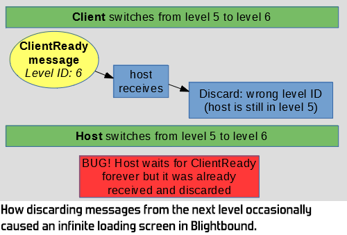 The second loading screen bug we had around that time had a similar cause, but in a different way. When a client is done loading, it tells the host so in a ClientReady message. The host needs to wait for that. Similar to the bug I described above, the ClientReady message was received but discarded because it was from the wrong level. The cause however was a different one.