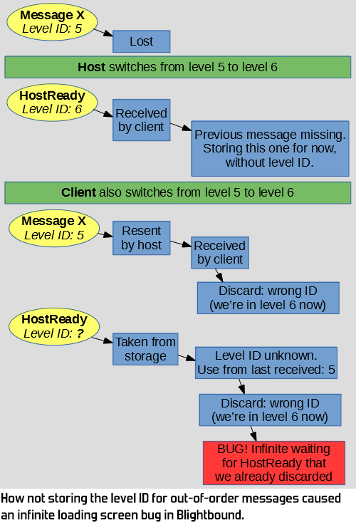This bug occasionally caused clients to get stuck in the loading screen forever. After adding additional logging we saw that the client never received the HostReady message. This is a message that the host sends to the clients to let them know that loading is done and they should get into the game. The client was forever waiting for that HostReady message. Upon further investigation it turned out that the host did actually send the message, but the client received it and then threw it away as irrelevant. Why was that?