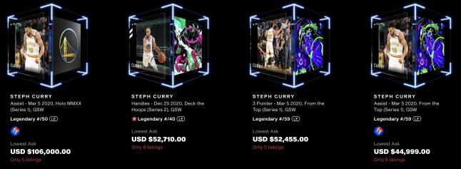 With it's near weekly drop schedule, Dapper Labs is putting new Moments into circulation all the time. Either multiple issues of commons from the current Series, or adding new Limited Edition issues. All-Stars, Cool Cats, Rising Stars, Seeing Stars, Etc. With each new limited issue set, they are releasing Moments of the same players again and again. As I write this, there are 14 different Steph Curry Moments available on the marketplace. At the high end is the LE Steph Curry Holo MMXX from Series 1. Of the 50 issued, 4 are currently listed for sale with the lowest asking price of $106,000. At the low end is the common card from the Base Set Series 2 with the lowest asking price of $25. The lowest price limited issue Steph is a the 2021 All Star card released just weeks ago with 2021 copies in circulation and an asking price of $640.