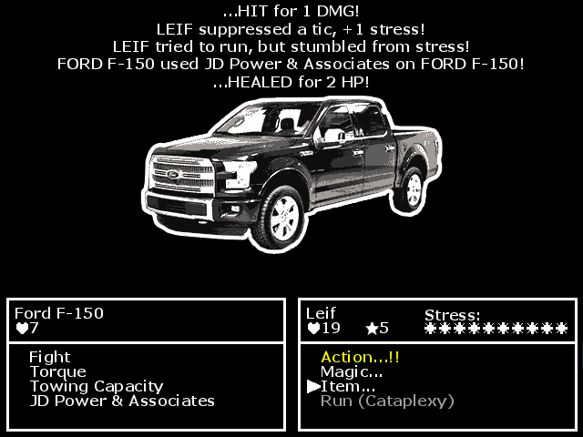 TouretteQuest is a simple Roguelike/Roguelite/Procedural Death Labyrinth/Russian bagel where your character has Tourette's Syndrome and Narcolepsy. On every floor of the procedurally generated dungeon, you will gain a new Tourette's or Narcolepsy symptom. Encounter a monster and a JRPG battle system akin to Dragon Quest pops up: