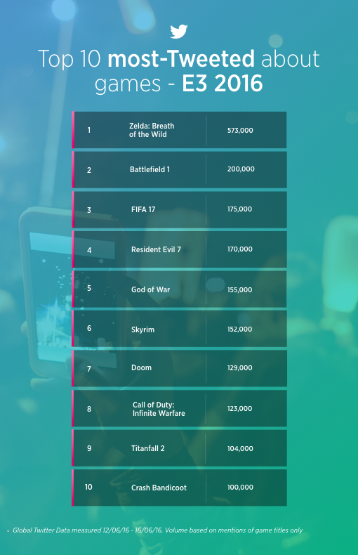 E3 week is drawing to a close, but even though it's not quite over yet Twitter has published a list of the ten most common game names mentioned on the social network during the event. Perhaps unsurprisingly, Nintendo's Zelda: Breath of the Wild topped the chart.