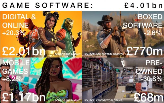 Breaking that down, overall software revenues eclipsed £4 billion ($5.21 billion) for the first time ever, rising by 10.3 percent year-on-year. As the graphic below shows, digital sales led that charge, with digital and online software revenue rising by 20.3 percent to £2.01 billion ($2.62 billion).