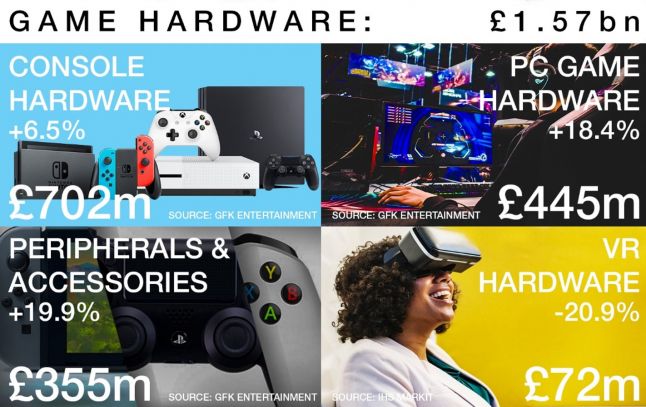 Game hardware also drove spending in 2018, with console sales rising by 6.5 percent to £702 million ($914.8 million), despite a lack of new devices on shelves. PC hardware also performed well, pulling in revenues of £445 million ($579.9 million), while peripherals and accessories also saw revenue rise by 19.9 percent to £355 million ($462.6 million).