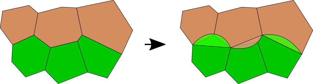 The overall shape is better, but the edges are still very straight and somewhat ragged in appearance. The way we cover that up is by using curved assets placed along the edges where the colors are different. The real trick however is that one curve is often placed over two edges, using their relative angles to determine the direction of the curve.