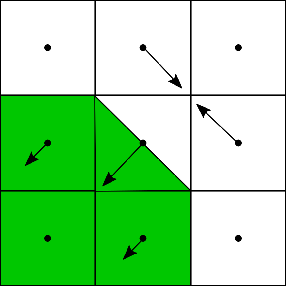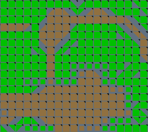 The real breakthrough comes when we start moving around the seed points in particular patterns to create rounded corners. The first step of this process is already taken inside the level generator. Corners are detected between ground types and the corner tiles are marked with different shapes, indicating how they should be deformed to generate a better looking environment: