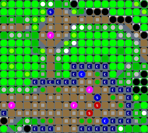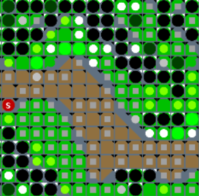 These tile maps are stacked, using different tiles to indicate tiles ground types (grass or dirt in this example) and various decorations. In this case there are some bushes (large green circles), Rocks (black circles), plants (small green circles), flowers (white circles), and decorative textures (gray squares). There also are special tiles that indicate gameplay data such as the spawning point marked with an 's'. In addition, tiles can be tagged with additional information such elevation or special subtypes.