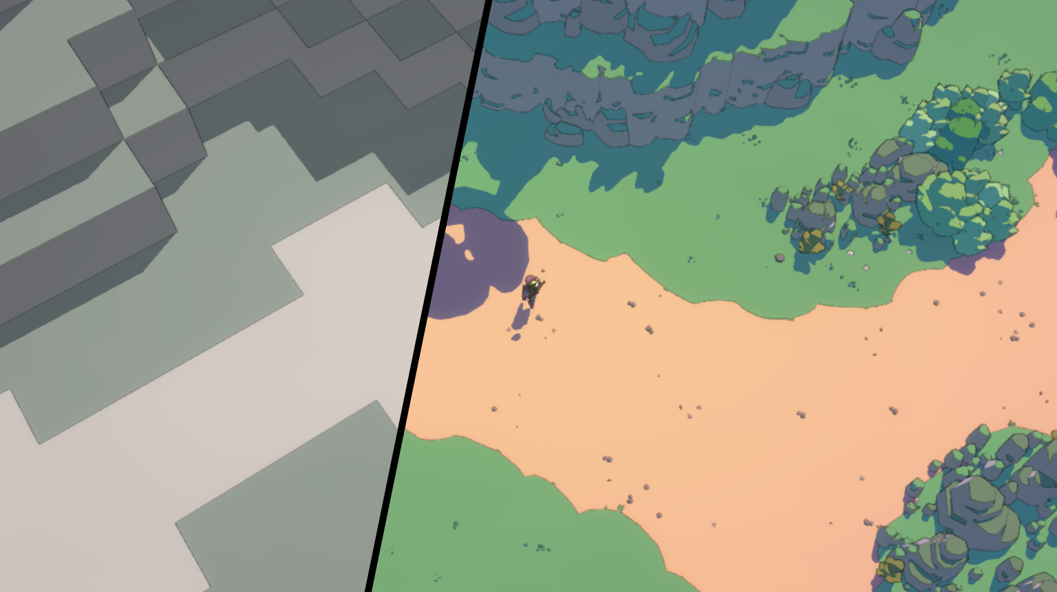 Unexplored 2: The Wayfarer's Legacy is a roguelite action RPG that has you traverse a fully generated landscape. We worked hard to make the landscape look beautiful and natural, even though the generated data for each level is a 2D tile map. Typical output looks like this:
